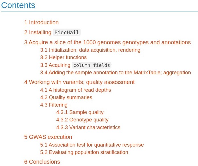 We have an R package in Bioconductor that runs through the following topics (this is just a screenshot, visit BiocHail at Bioconductor for the real thing at Bioconductor for details):