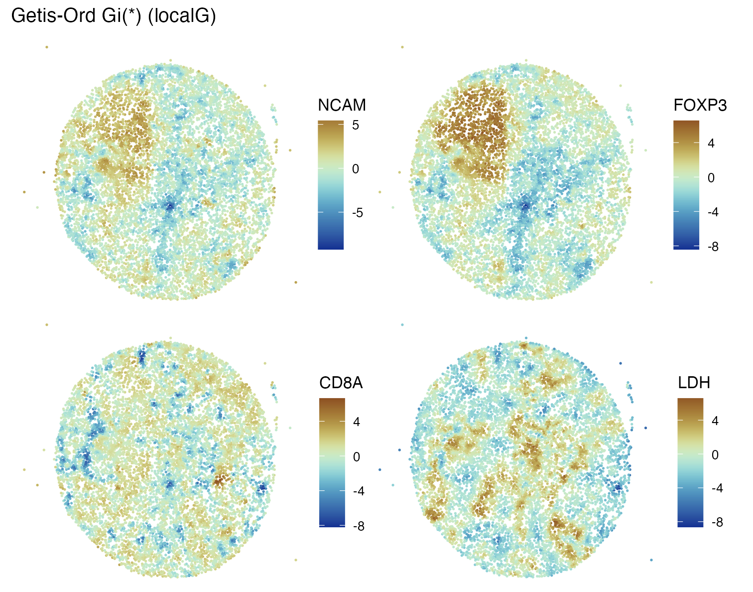 Getis-Ord’s Gi* statistic is reported on a Z-score scale and has been used to characterize hot spots in spatial surveys.