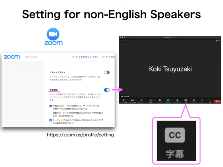 Zoom has a live transcription feature. We have applied this feature to English-speaking presenters in an attempt to lower the barriers for understanding English.