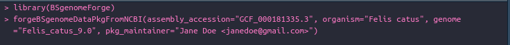 BSgenome is a Bioconductor package with many uses, among which one of them is forging BSgenome data packages. Forging is another word used to mean creating a package. BSgenome is a combination of BS, which is short for Biostrings a package used for manipulation of biological strings, and genome, which is the complete set of genetic material in an organism. BSgenome data packages have many applications in the real world, especially in light of the current COVID-19 pandemic. They can be used to find the COVID-19 genomic sequence and study it, and even be used by environmental scientists to look for COVID-19 in wastewater. There are several reasons the average Bioconductor user would forge a BSgenome data packages; in order to search for particular DNA patterns in a genome, maybe to compute GC content and other basic statistics or even to extract the DNA sequences for some regions of interest like genes or CDS and translate them into amino acid sequences. However, the current process of forging a BSgenome data package is quite long and confusing, with a few redundant processes like creating a seed file before calling the forgeBSgenomeDataPkg function on the seed file to create the package.